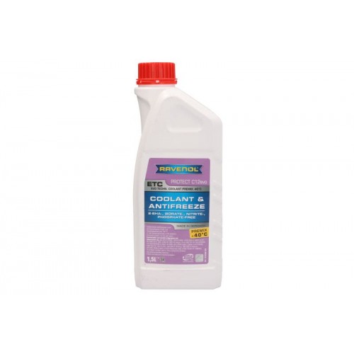 RAVENOL ETC Premix -40°C Protect C12evo“ yra paruoštas naudoti, ekologiškas aušinimo skystis be 2-etilheksano rūgšties, iš anksto sumaišytas su vandeniu. Tai aušinimo skystis be boratų, nitritų ir fosfatų, skirtas vidaus degimo variklių aušinimo grandinėms, pagamintas 1,2-etandiolio (monoetilenglikolio) pagrindu, kuris užtikrina nereikalaujančią priežiūros apsaugą nuo korozijos ir užšalimo. Šis produktas sukurtas kaip ilgalaikė radiatoriaus apsauga, pagrįsta naujausia Si-OAT technologija. Organinės rūgštys kartu su mineraliniais silikatais užtikrina geriausią įmanomą apsaugą.